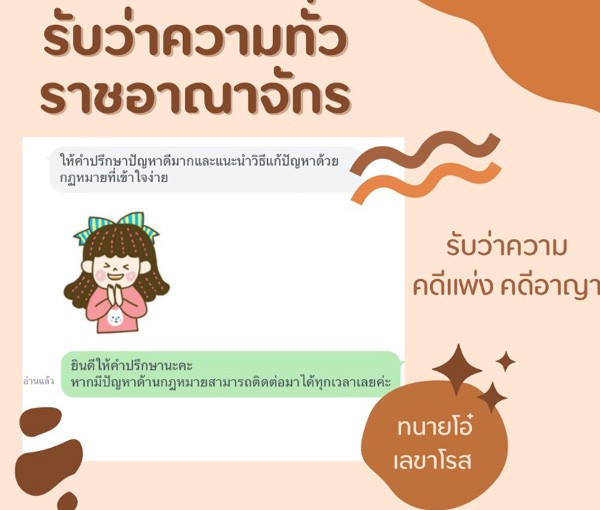 | ปรึกษาคดี (ครั้งแรก) | วิเคราะห์ทางเลือก/เอกสารที่ต้องใช้ | คิดเป็นครั้ง หรือหักล้างค่าดำเนินคดี |